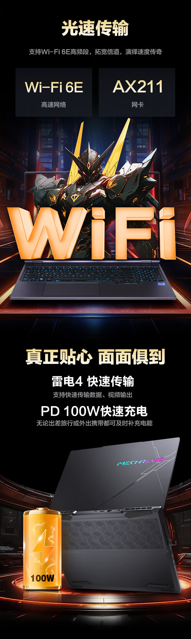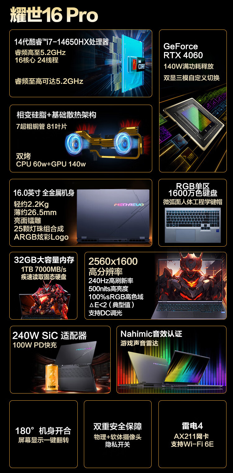 型号:机械革命耀世16Pro 无线网卡:双天线Wi-Fi 6E 内存:DDR5 32G