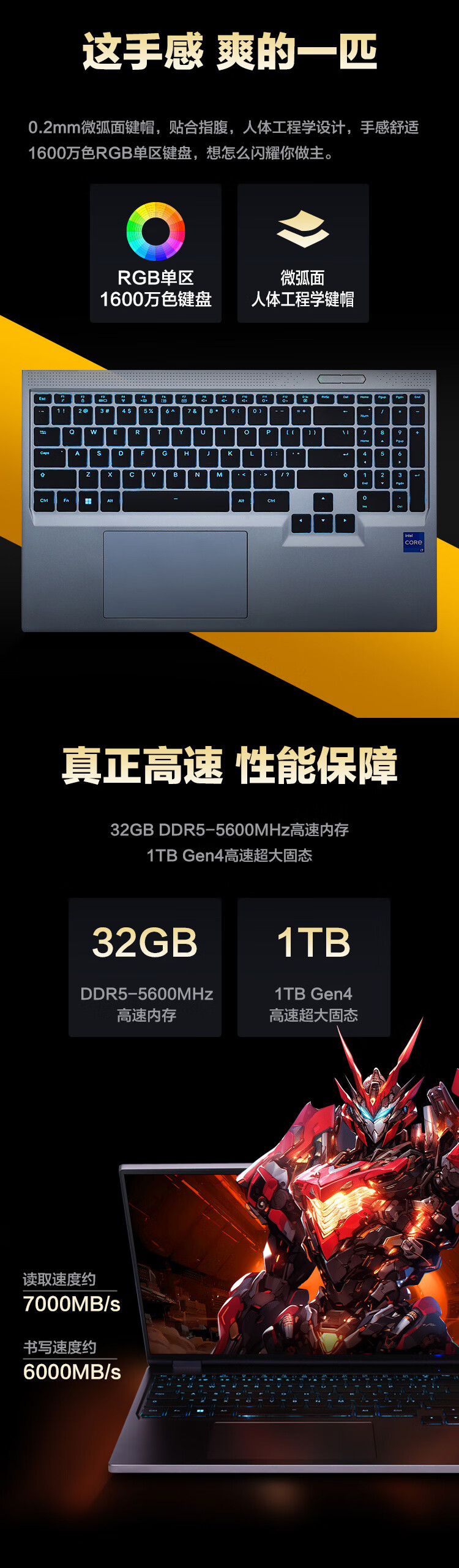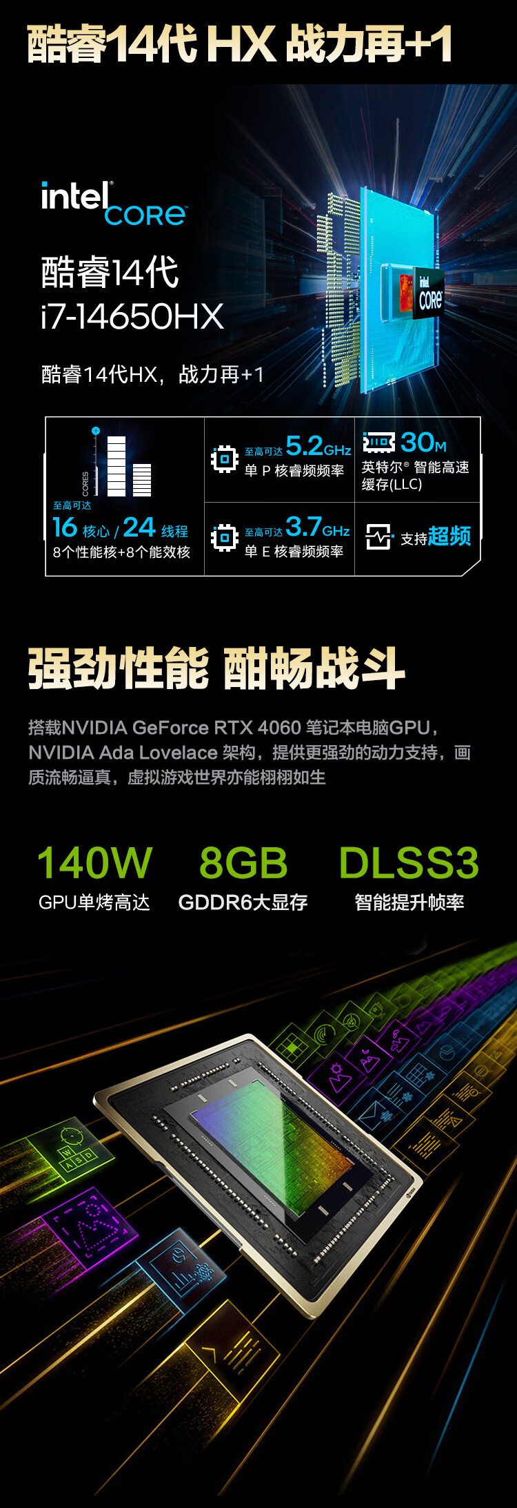 贮存:1T高速固态 CPU型号:i7-14650HX 显卡型号:140W满功耗RTX 4060