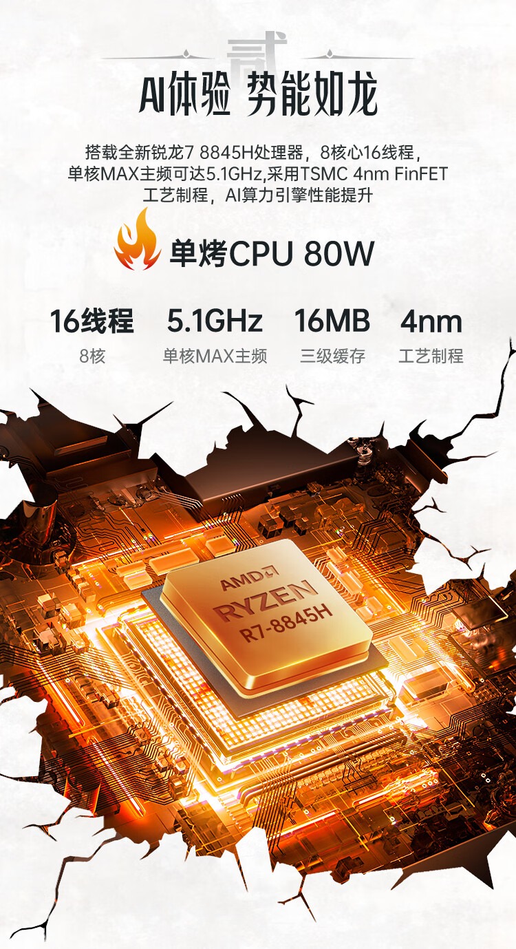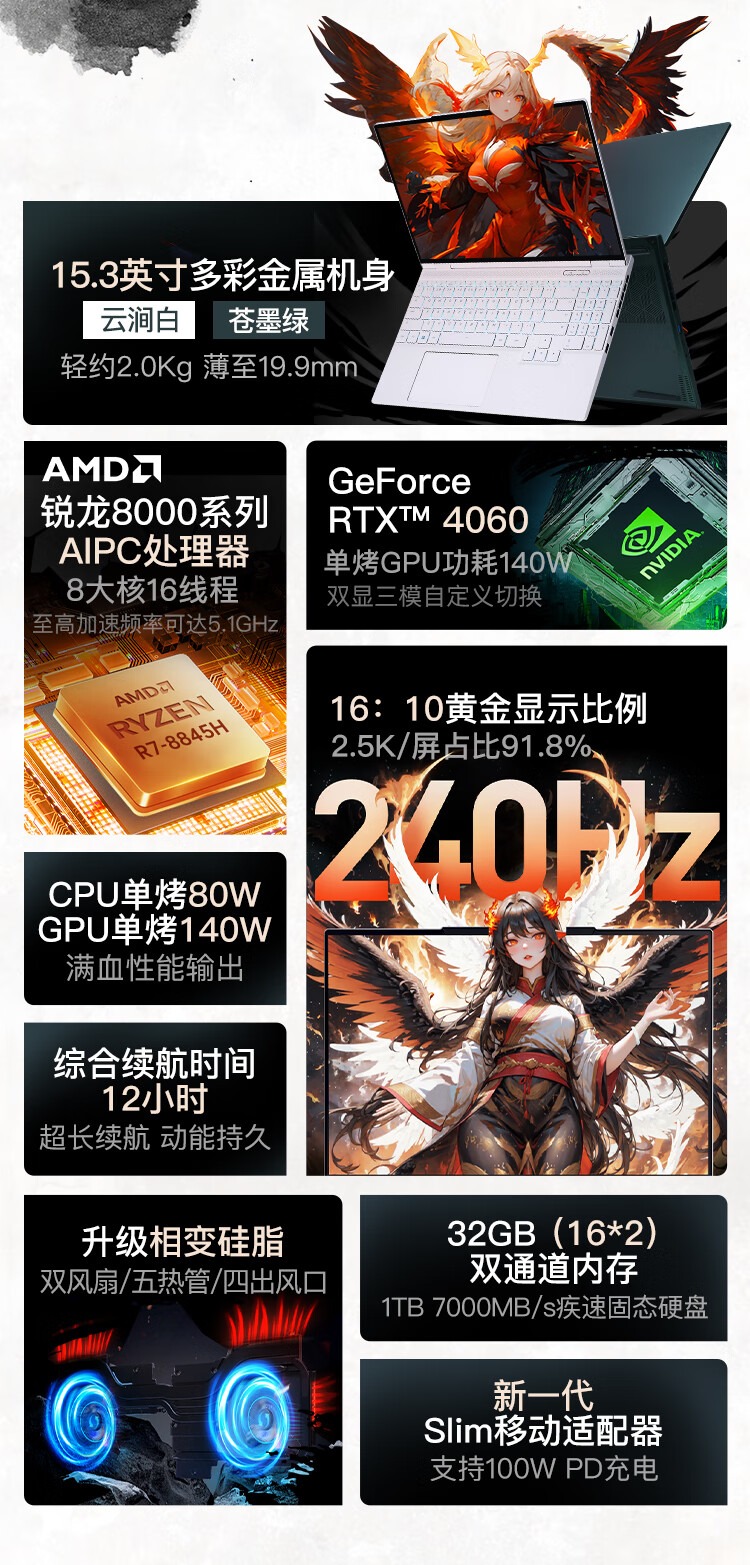 贮存:1T高速固态 CPU型号:R7-8845H 显卡型号:140W满功耗RTX 4060